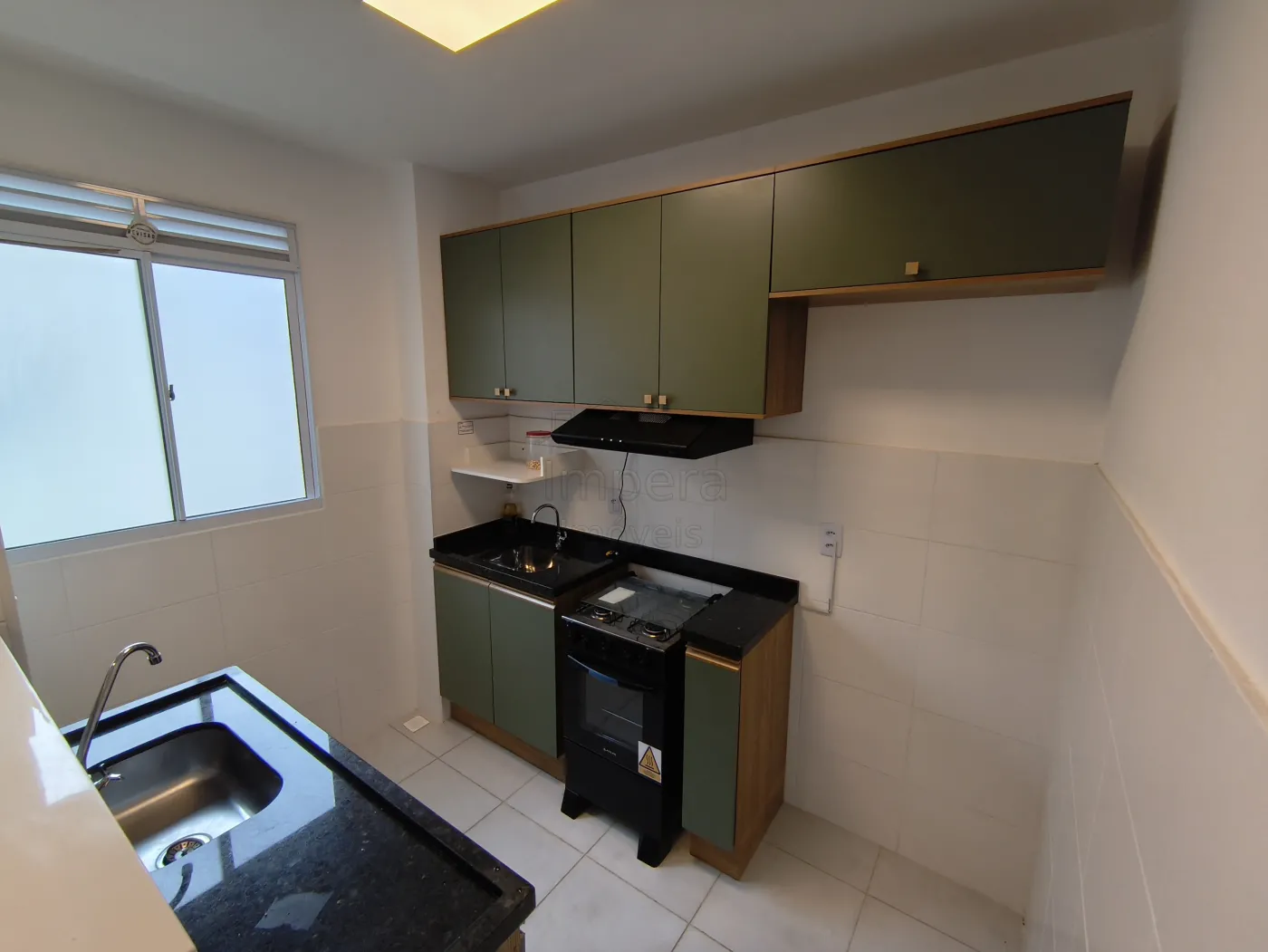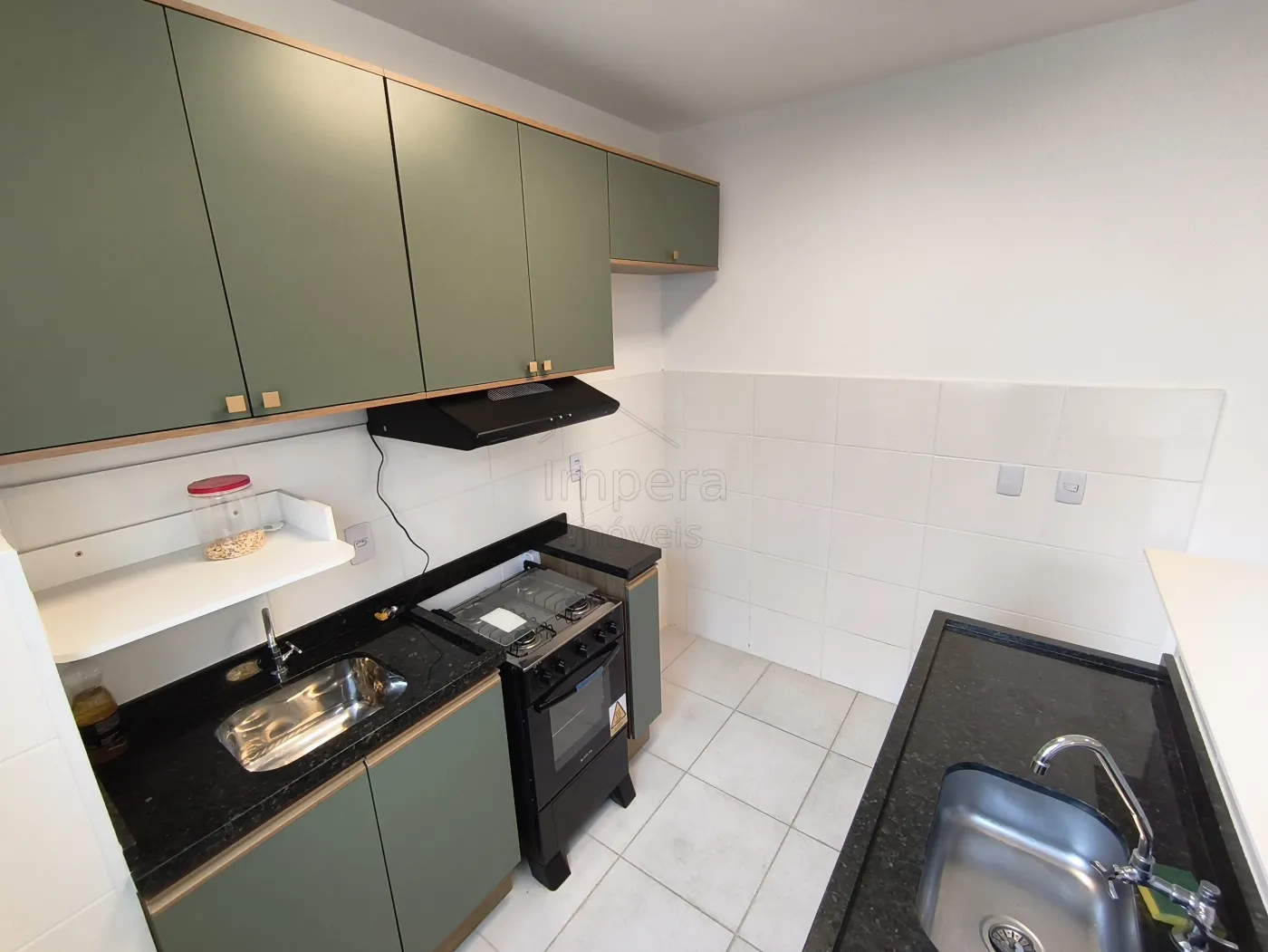 Cozinha com piso cerâmica, equipada com armários planejados, fogão e exaustor