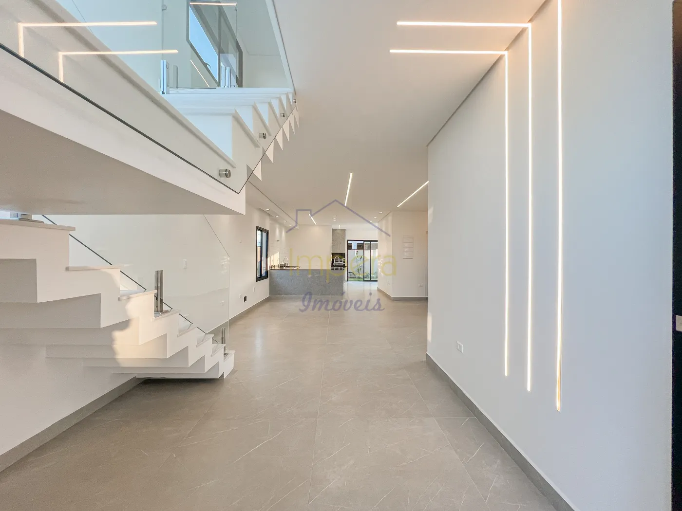 No pavimento térreo, o imóvel conta com sala ampla, saleta, cozinha em conceito aberto com bancada em granito preto em formato U, integrada à sala de jantar, área gourmet com churrasqueira, escritório, lavabo, lavanderia e quintal com infraestrutura para instalação de piscina ou hidromassagem. No pavimento superior, possui sala de TV, 3 dormitórios sendo 1 suíte master com closet e sacada, além de dois dormitórios amplos com sacada e banheiro social.