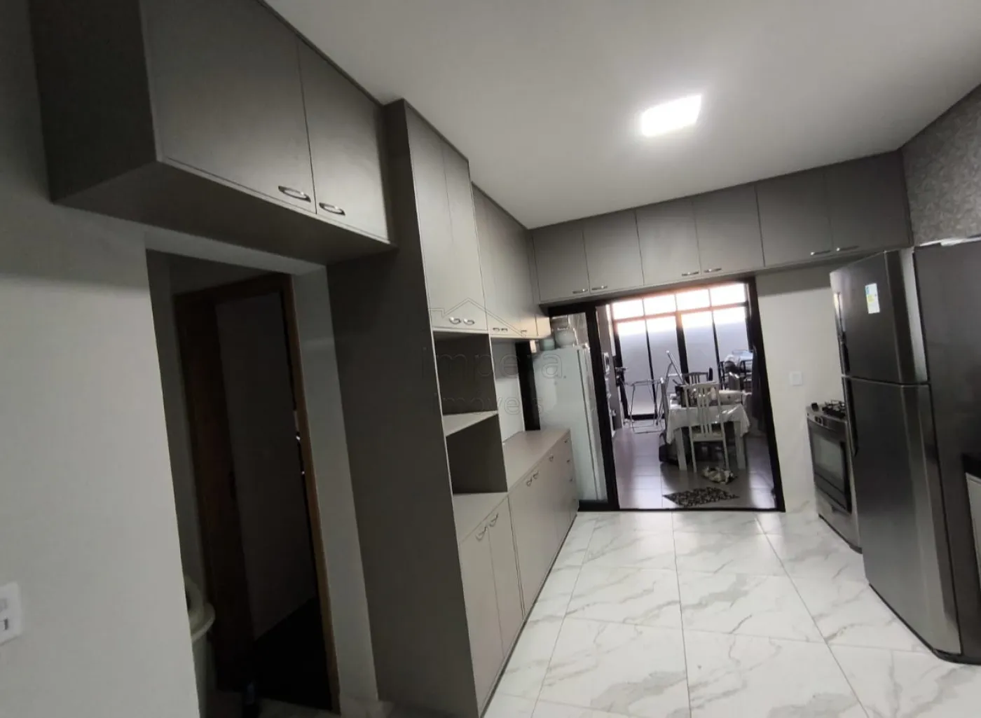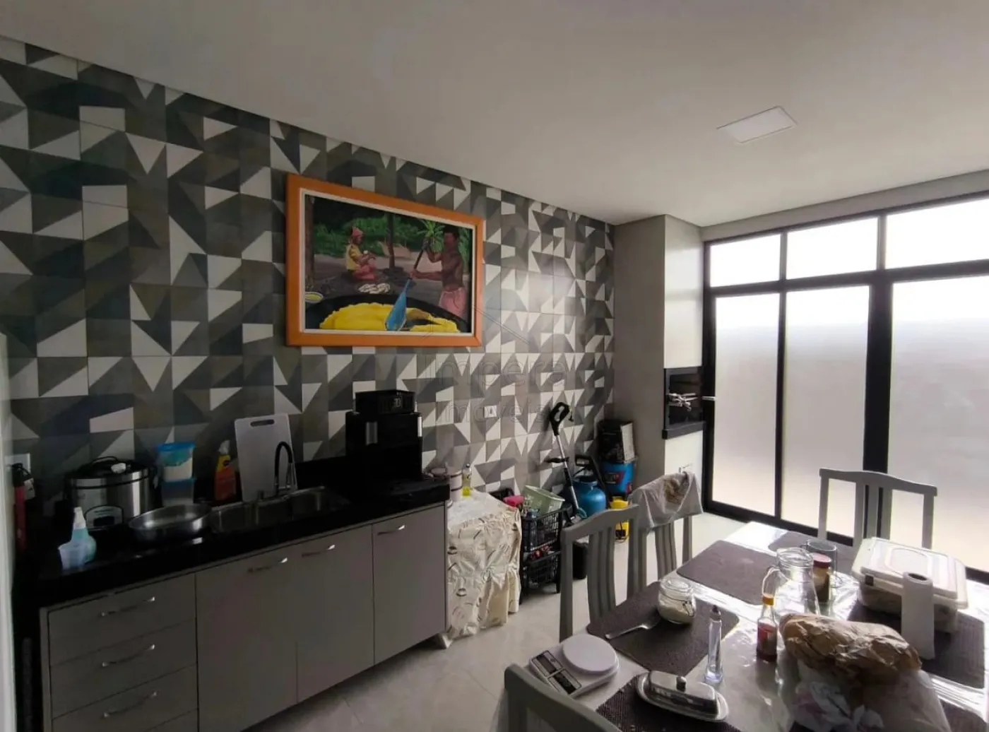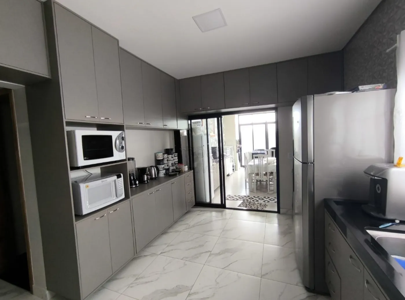 Cozinha com armários planejados, integrada à área gourmet com churrasqueira, perfeita para momentos de lazer.