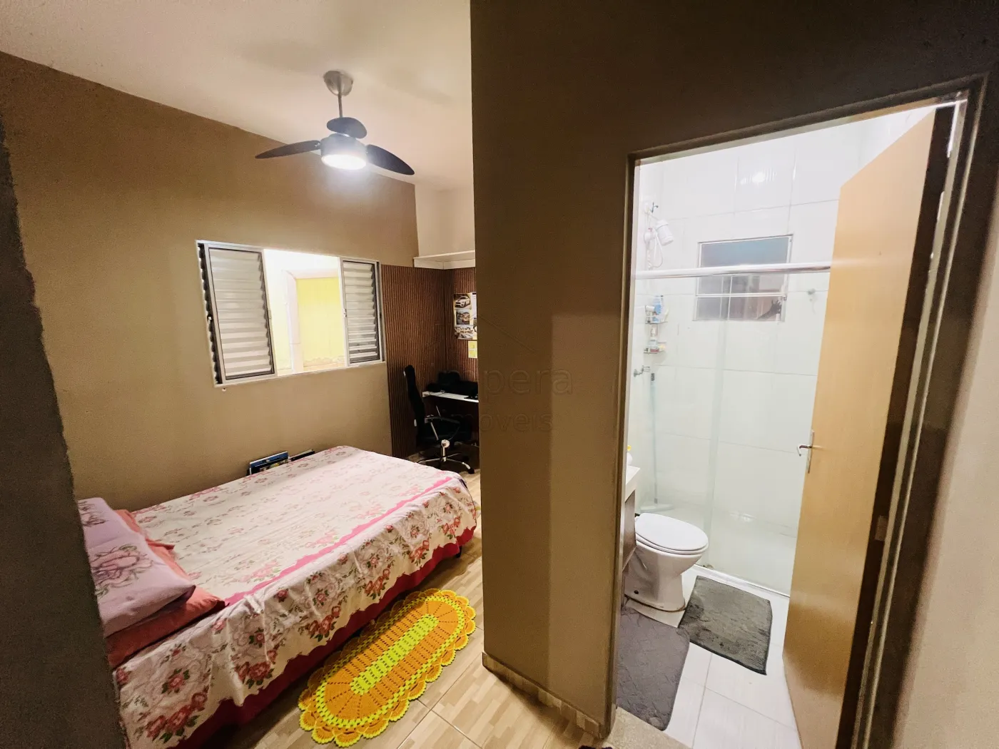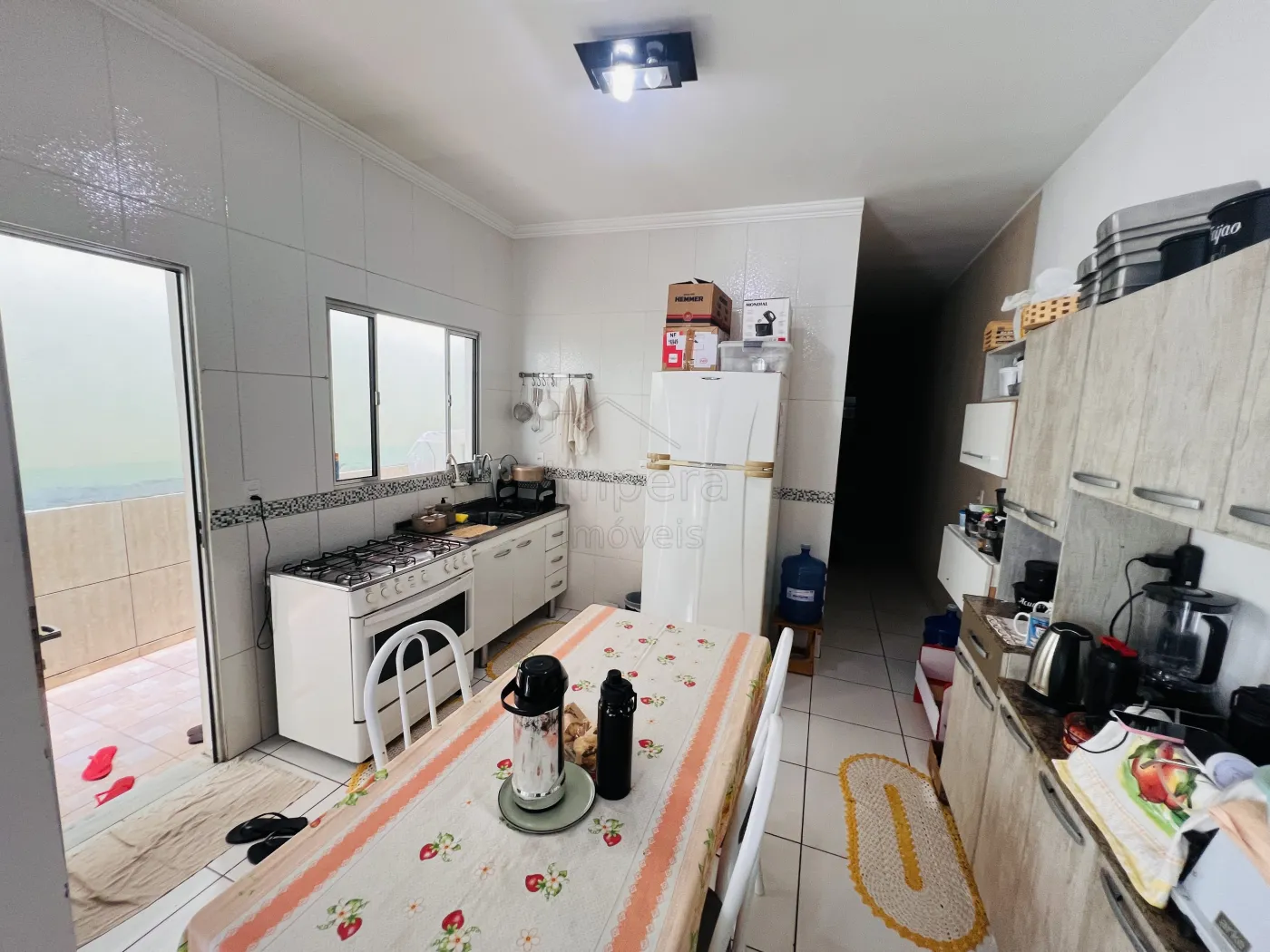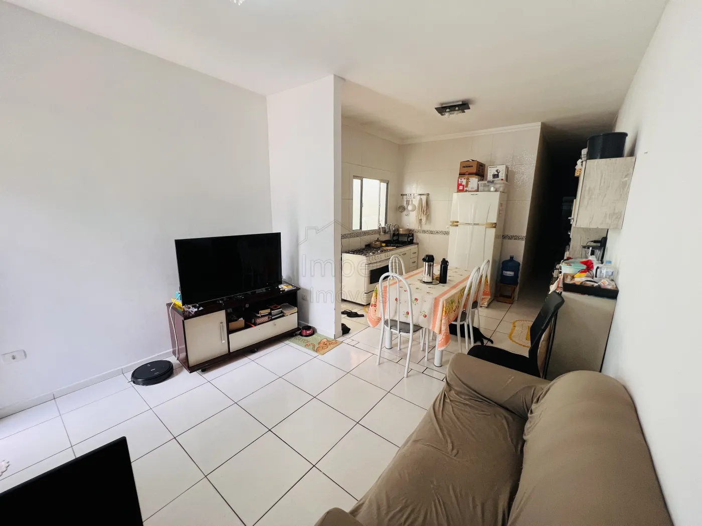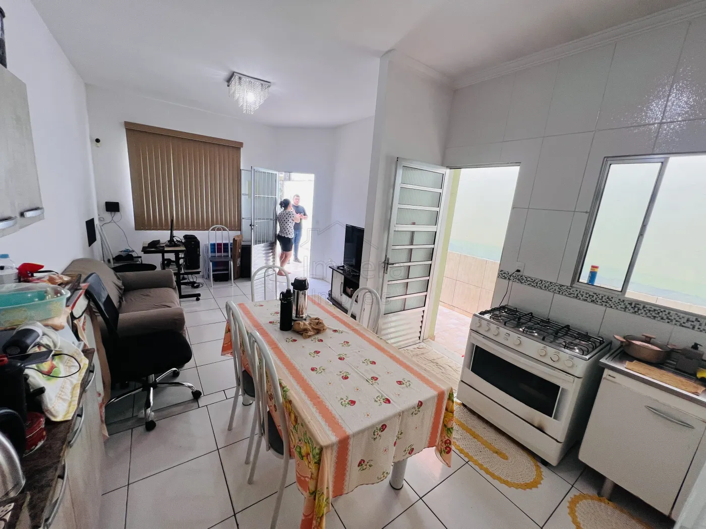 Imóvel com 3 quartos, 1 suíte, 1 banheiro social, cozinha integrada com sala de estar, área de serviço coberta, e garagem descoberta com vaga para dois carros.